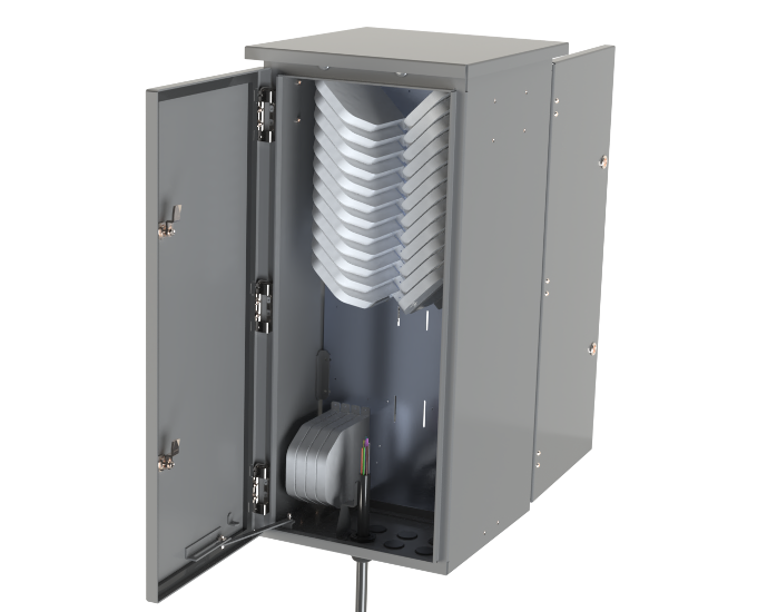 Our Fiber Distribution Hub (FDH) system provides a crucial connection from the feeder network to the distribution network, offering scalable distribution capabilities ranging from 96 to 432 ports. Designed for applications beyond FTTx PON, the FDH features structural, lightweight, and corrosion-resistant materials. It is powder coated for durability, uses 300 series stainless steel hardware/fasteners for longevity, and includes heavy-duty cable clamps to prevent twisting and movement of cables. Front and rear access doors with door gasket seals ensure secure access, and cables can enter or exit from the bottom. A 35-port removable foam block staging area aids in organization, and a color-coded key mounted inside the panel directs patch cables. The unit includes two door locks and accommodates up to 432 ports with a maximum of 48 feeder ports.